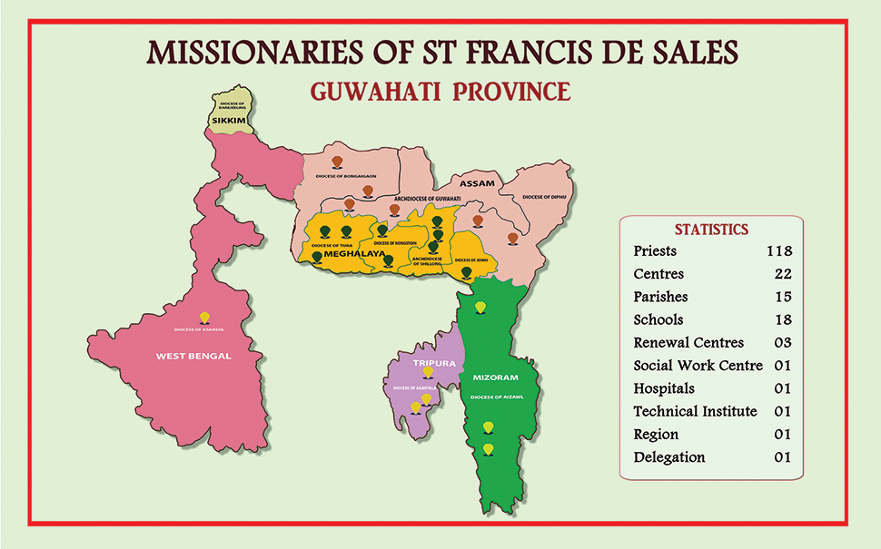 As per the decree of the Superior General, the Province of Guwahati and the Province of Dibrugarh of the Missionaries of St. Francis de Sales were erected from the former North East India Province and formally came into effect on 24 January 2020. Fr. Sabu Francis Manasrayil was appointed the first Provincial of the newly established Province of Guwahati.